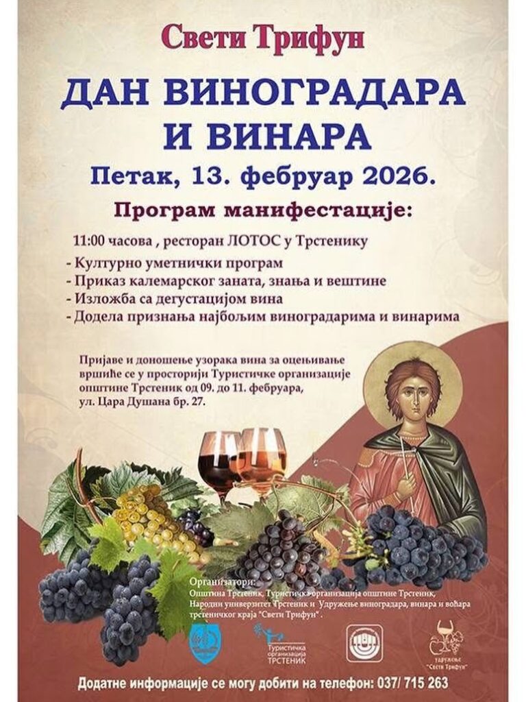 Са великим задовољством позивамо вас на манифестацију „Дан винара и виноградара“, која ће се одржати 13. фебруара са почетком у 11 часова у ресторану „Лотос“.