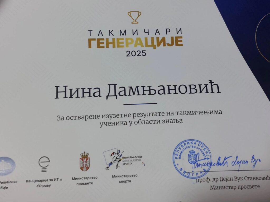 ПочетнаАктуелностиНина Дамњановић међу најбољим ученицима Србије – "Такмичар генерације 2025"
