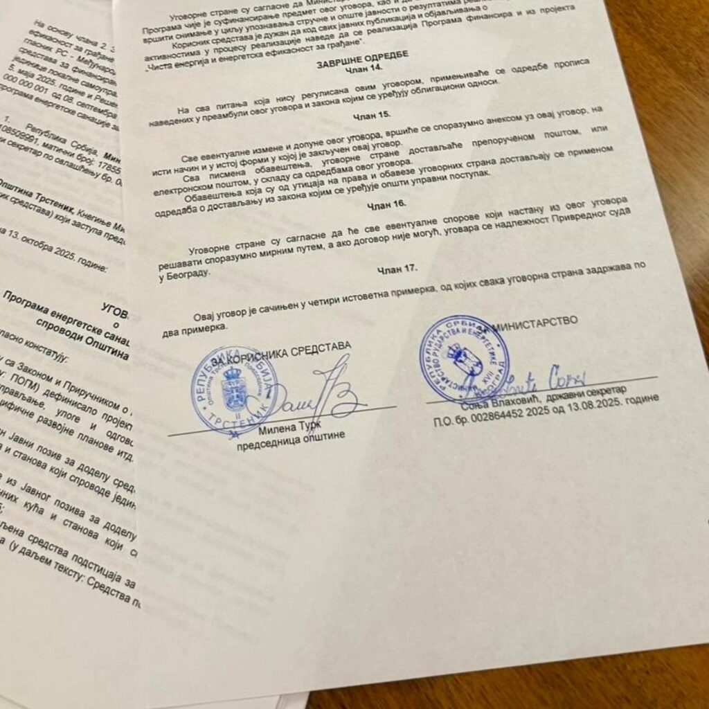 Помоћник председнице општине Трстеник, Владимир Дачић, присуствовао је свечаном потписивању уговора у оквиру пројекта „Чиста енергија и енергетска ефикасност за грађане“, који се реализује у сарадњи са Министарством рударства и енергетике Републике Србије.